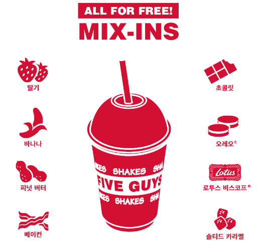 기본으로 무한리필 탄산음료를 주문해서 원하는 음료를 맛볼 수도 있고요 셰이크를 주문하시려면 초콜릿, 피넛버터, 솔티드캐러멜, 바나나, 딸기, 오레오, 로투스비스코프, 베이컨 모든 믹스인은 추가금액 없이 선택가능합니다.